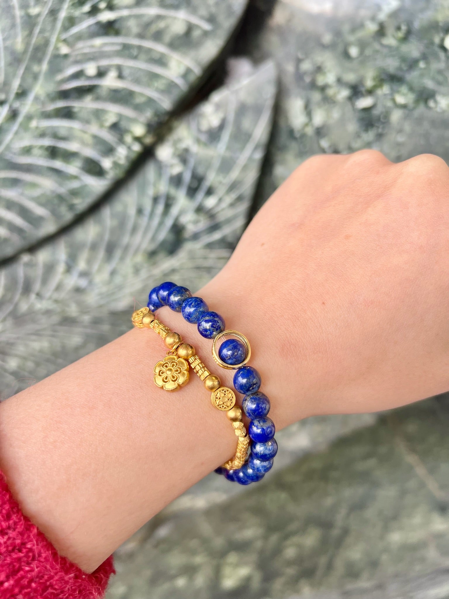يجمع هذا التصميم بين اللون الأزرق السماوي العميق لحجر اللازورد بقطر 8 مم والتألق الذهبي لحجر السترين الرئيسي، ليرمز إلى الحكمة والوفرة والقوة الشخصية. ولإضفاء التوازن على التصميم، تُحيط حبة لازورد واحدة بحلقة من الفضة الإسترلينية المطلية بالذهب، وهي لمسة تُكمل جمال السوار ودلالته.