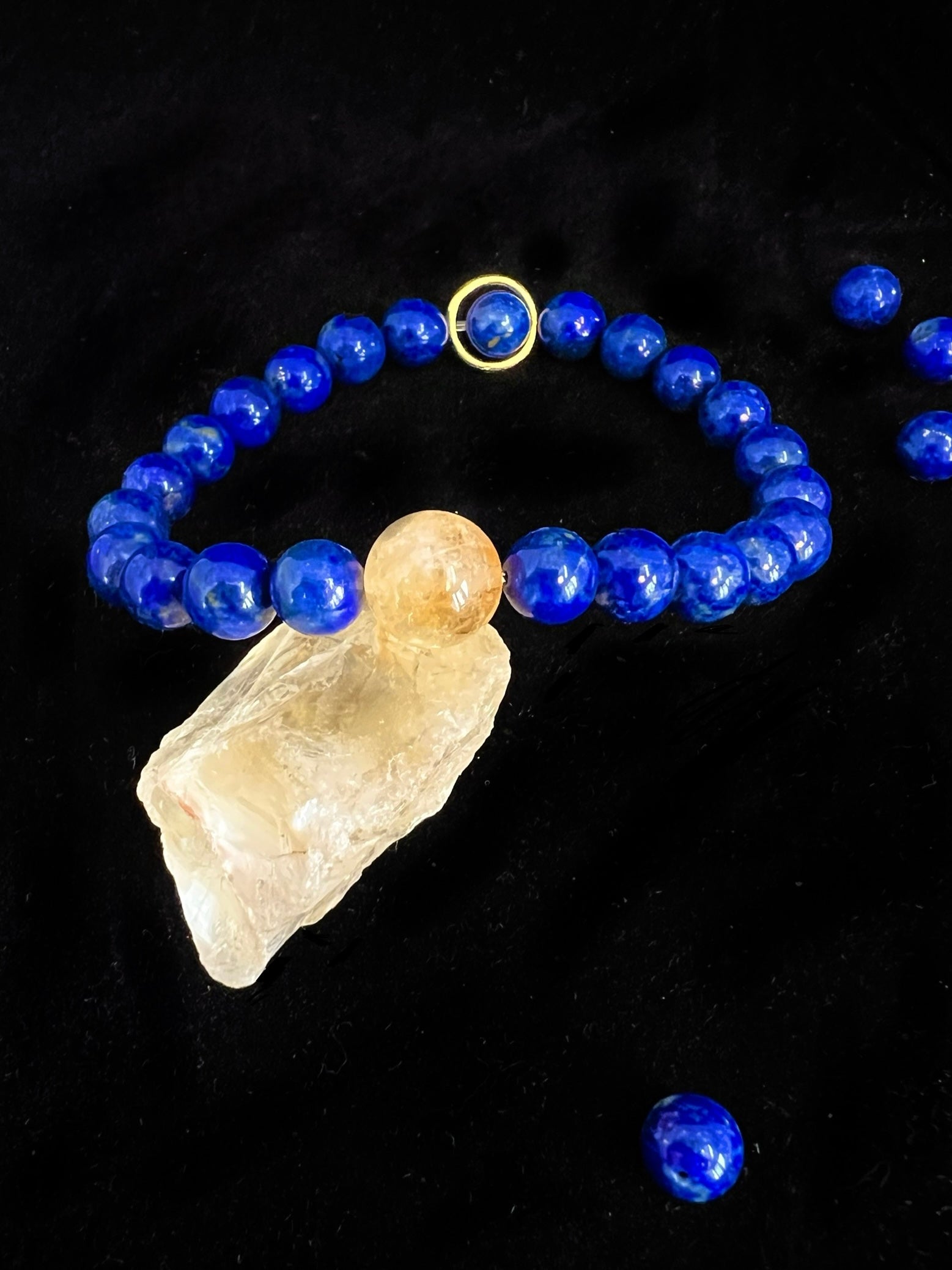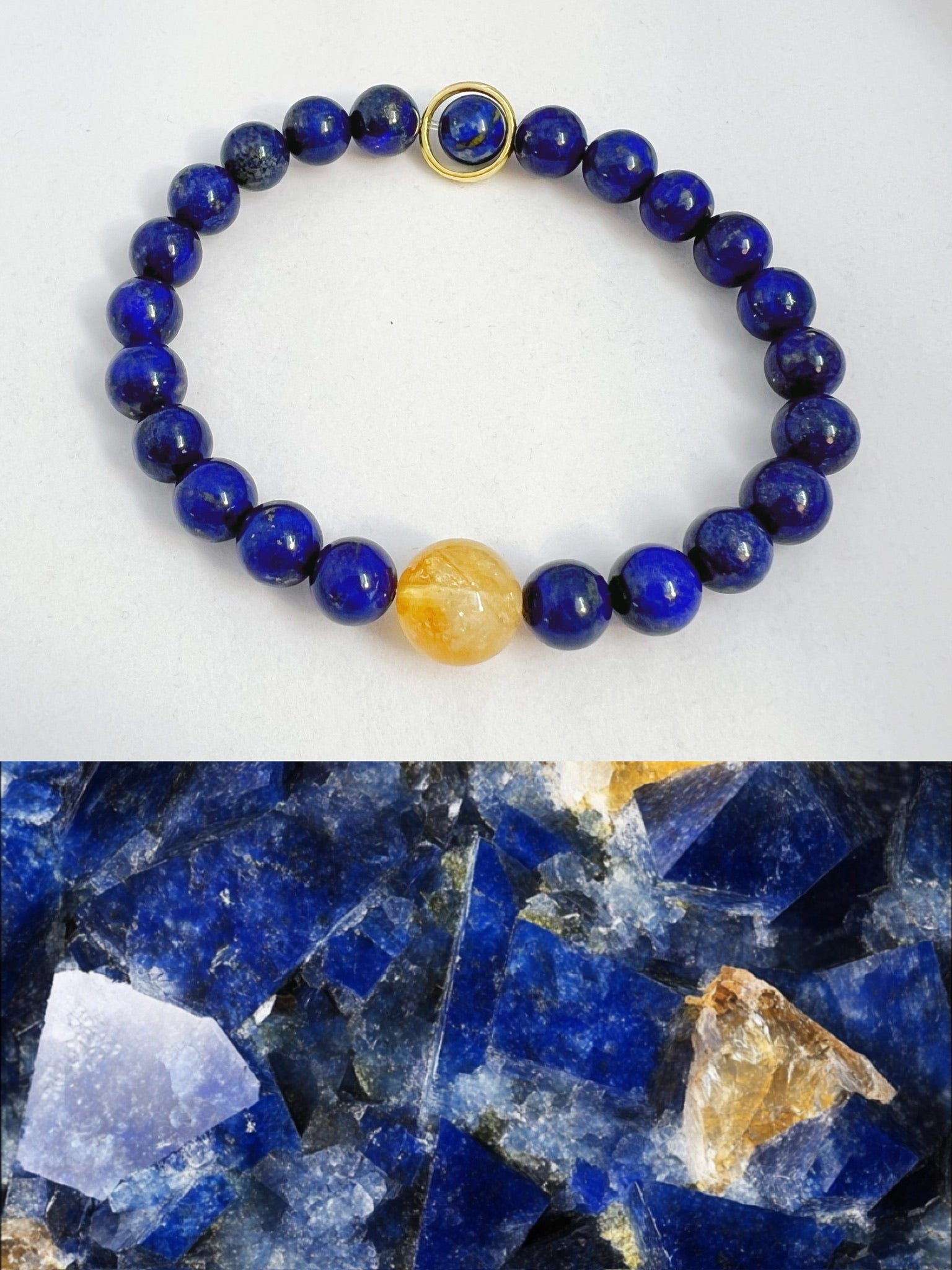يتناغم اللازورد مع شاكرا الحلق، مشجعًا على التواصل الواضح والتعبير عن الذات، بينما يتناغم السترين مع شاكرا الضفيرة الشمسية، مشعلًا التحفيز والإبداع والقوة الداخلية. معًا، يُنشئان تناغمًا بين الفكر والطاقة، مثاليًا لكل من يسعى لقيادة مصيره بنفسه.
