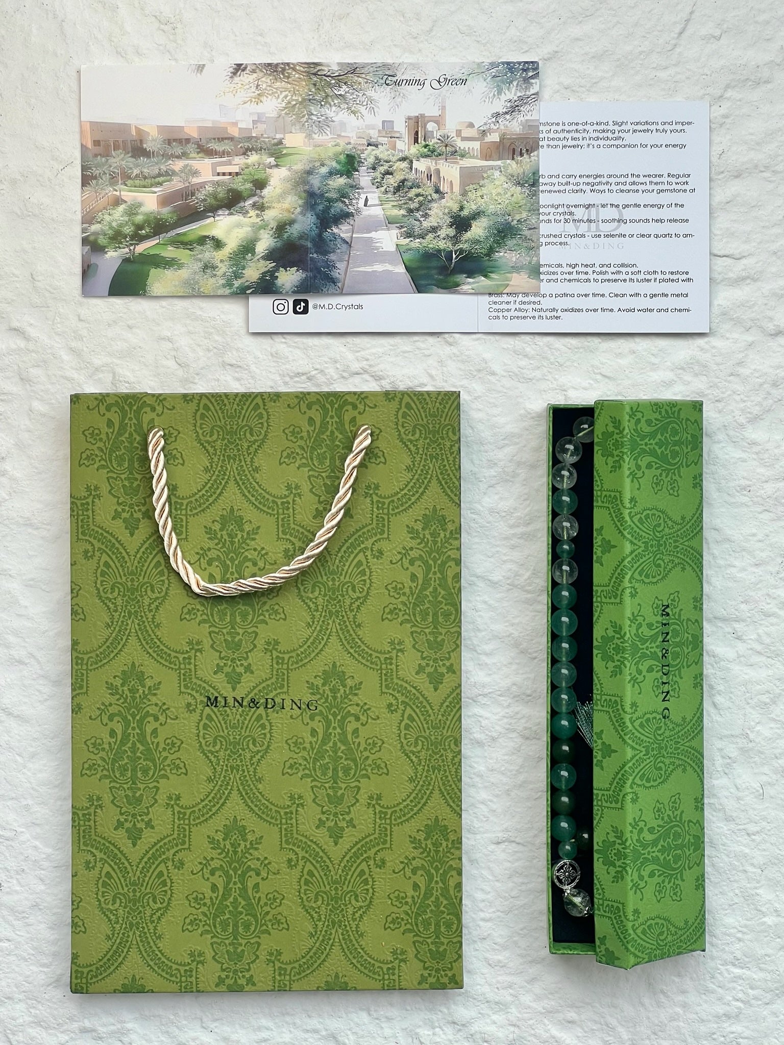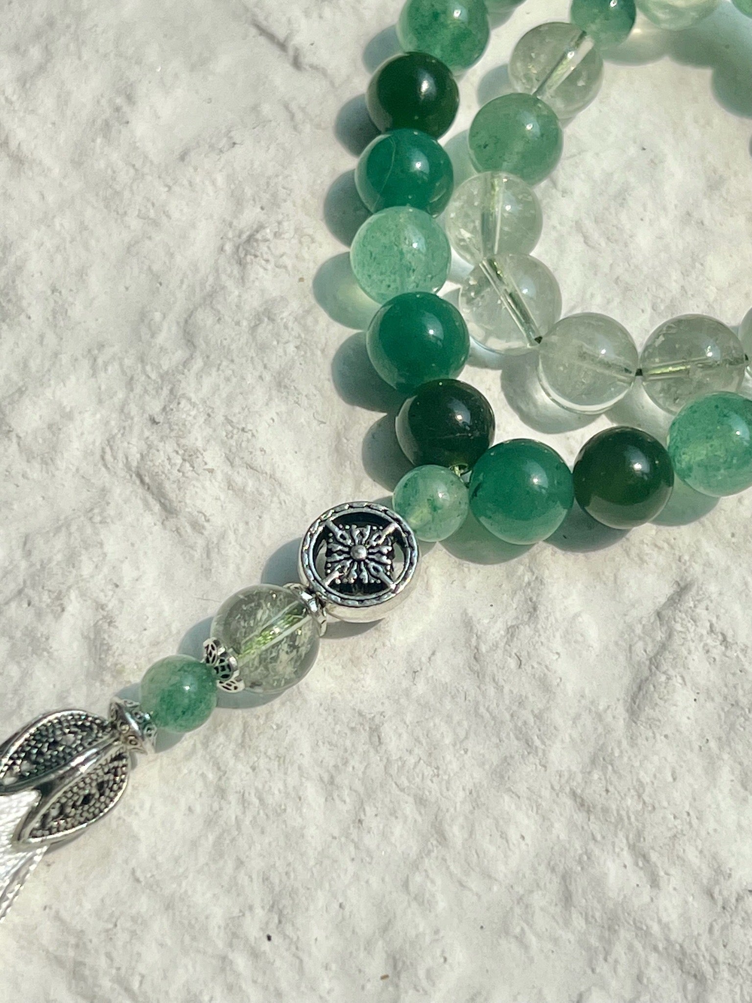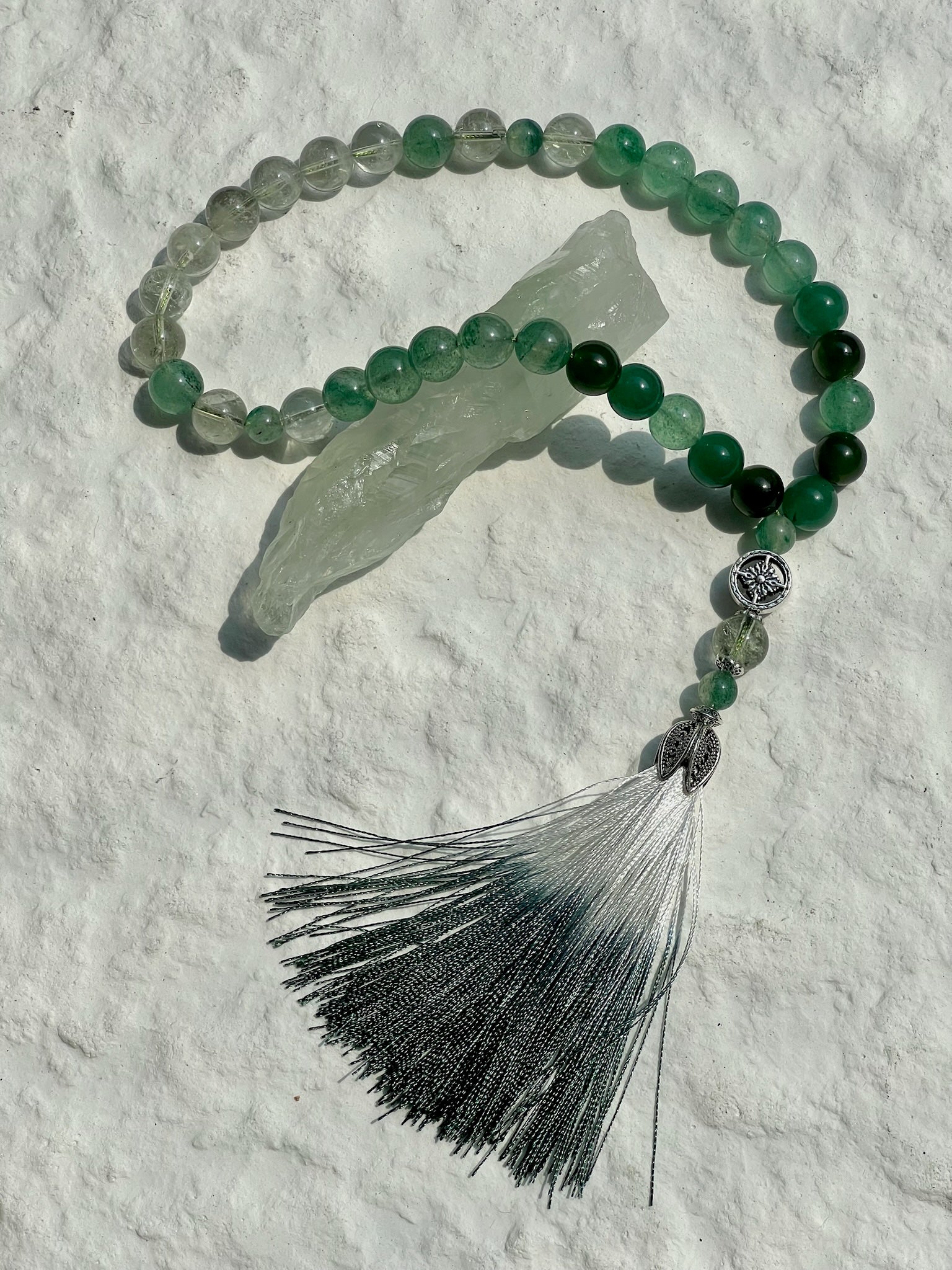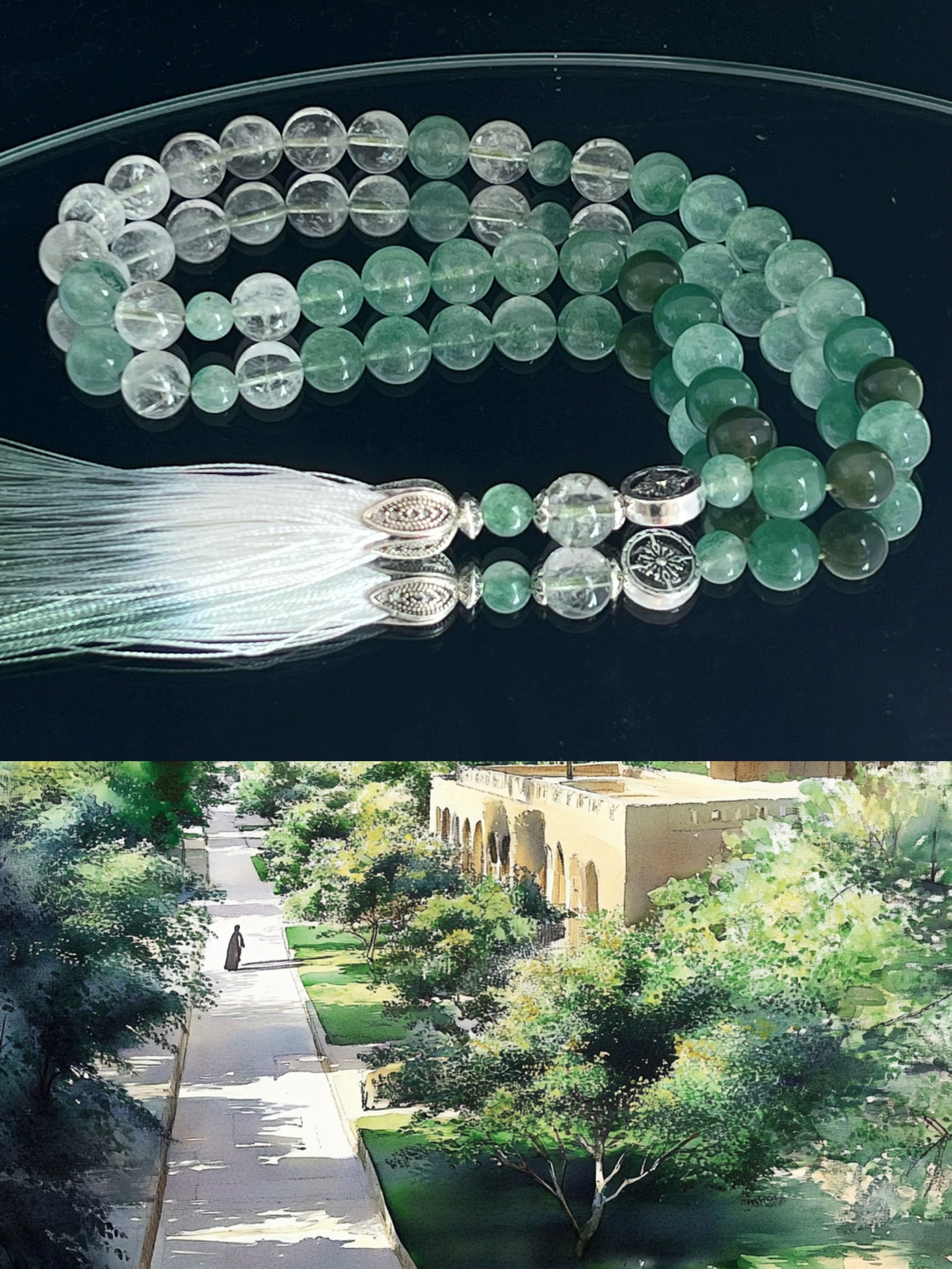 مستوحاة من مبادرة "التحول إلى الأخضر" ، تُشيد هذه المسبحة بالتجديد والاستدامة والتناغم الروحي. ترمز ألوان اليشم الغنية إلى الحكمة والحماية، بينما يُضفي الكوارتز الأخضر والأفينتورين الأخضر طاقات النمو والتوازن والازدهار. وكما تُعزز مبادرة "التحول إلى الأخضر" مستقبلاً مُنسجماً مع الطبيعة، تُذكّرنا هذه القطعة بأهمية تنمية الوعي، وتقبّل التجديد، واتباع نهج التغيير الإيجابي.