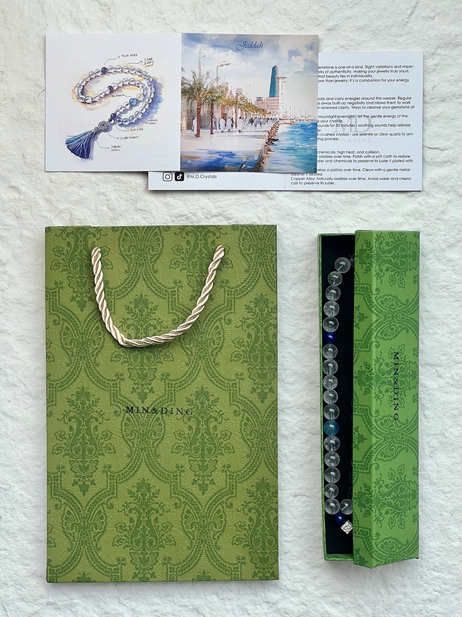 Jeddah, the gateway to the holy cities, is renowned for its coastal beauty and cultural diversity. The blend of ocean-blue Aquamarine, Lapis Lazuli, and Clear Quartz beads echoes the Red Sea’s azure waters and the city’s welcoming openness to various cultures. Handcrafted with care, this Misbaha celebrates Jeddah’s vibrant spirit and its embrace of tradition and modernity.